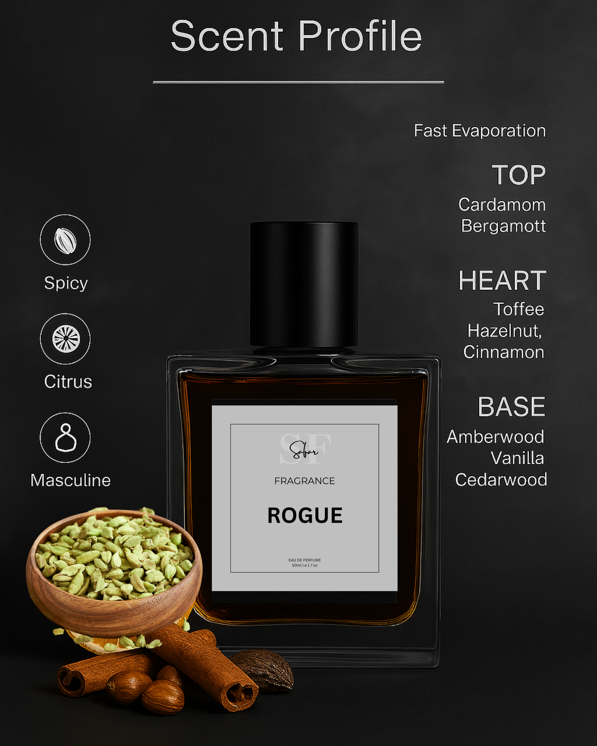 Rouge is a statement of confidence and charisma. It opens with the spicy warmth of cardamom, creating an inviting and bold first impression. The heart unveils a rich toffee accord, adding a smooth, seductive sweetness. As it settles, the deep, smoky essence of amber wood leaves a lasting trail of mystery and allure. Perfect for evening wear and special occasions, Rouge is for those who command attention effortlessly.
